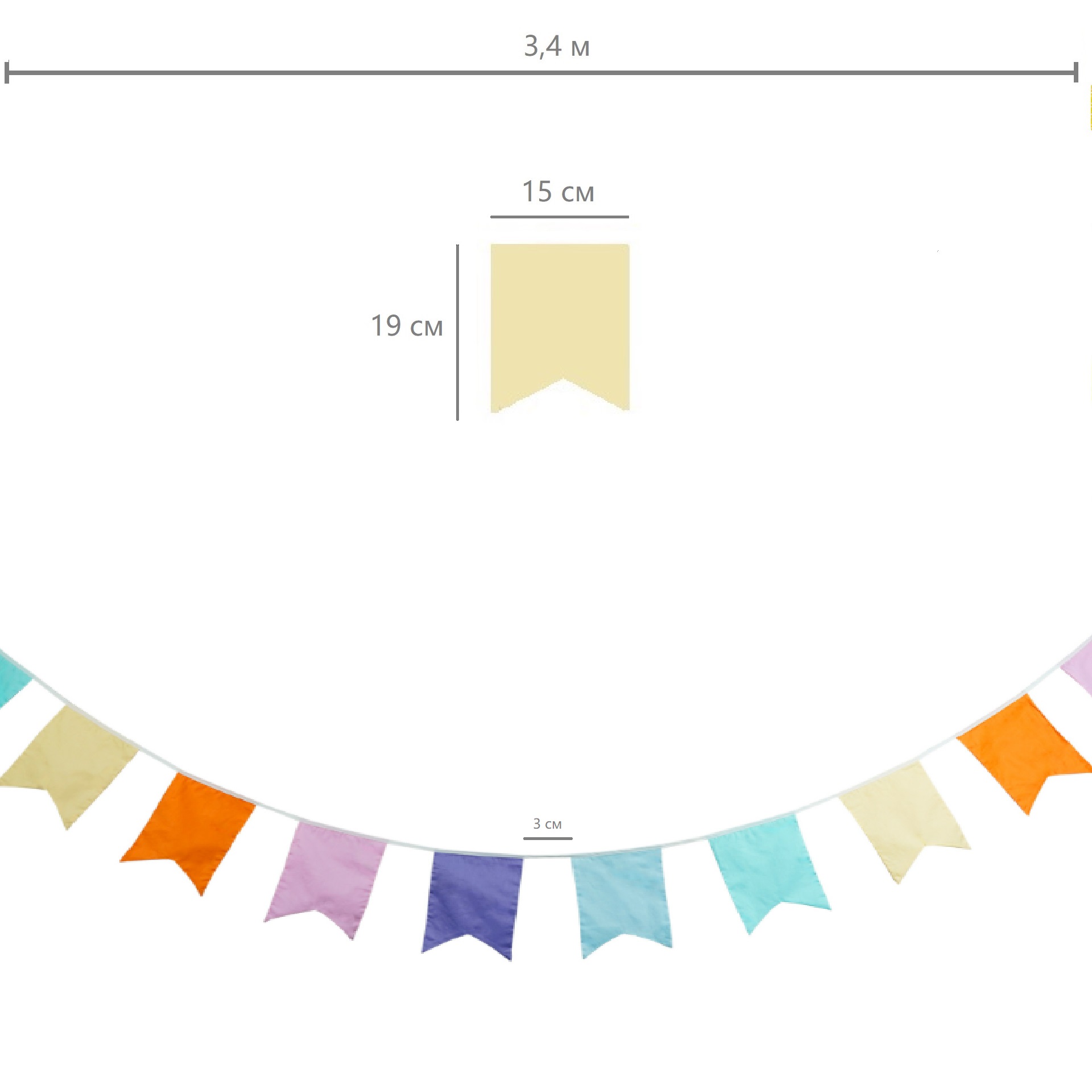 Гирлянда состоит из 12 флажков, общая длина составляет 3,4 м, расстояние между флажками 3 см, длина матерчатых флажков 2,1 м, длина лямок с обеих сторон по 50 см