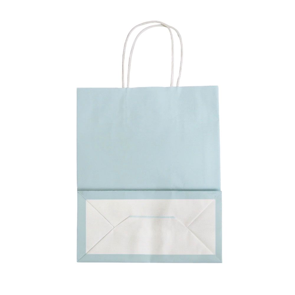 Подарочный пакет из крафтовой бумаги пастельного оттенка с белыми бумажными ручками и белой внутренней стороной.