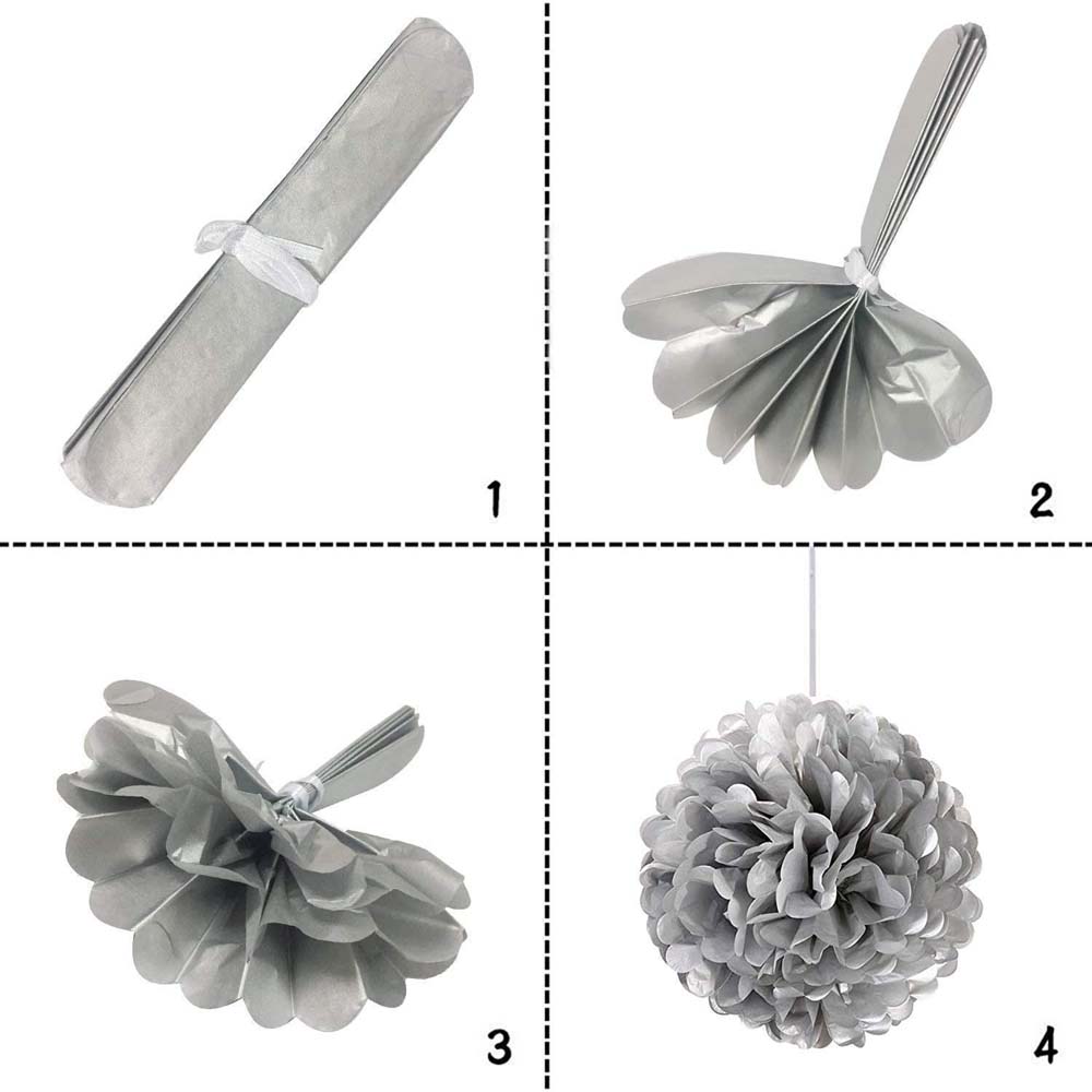 Серебряный бумажный помпон диаметром 50 см — стильное и лёгкое украшение для праздников, фотозон, витрин и интерьера. Отлично подойдёт для дней рождений, свадеб, вечеринок и тематических мероприятий.